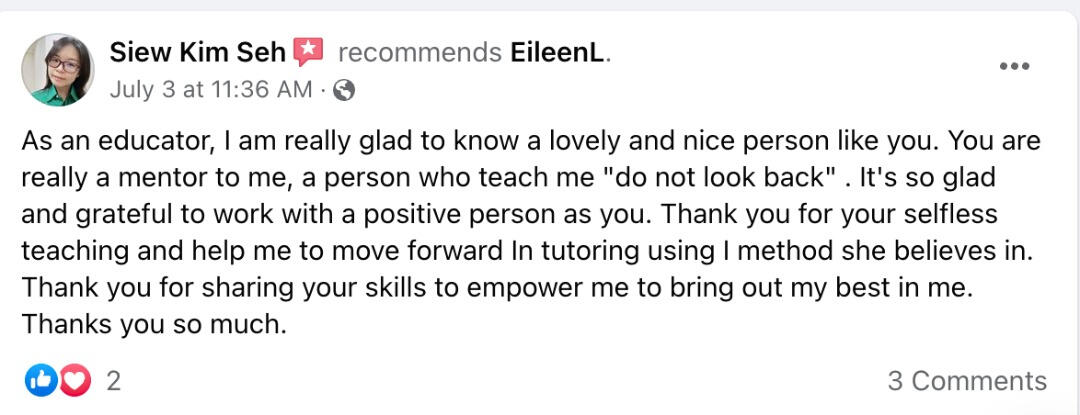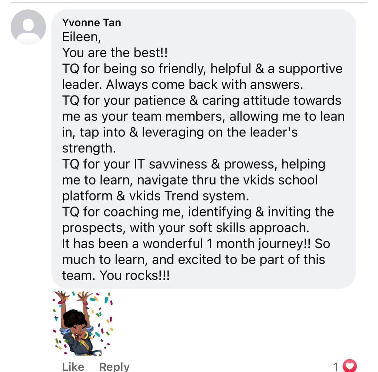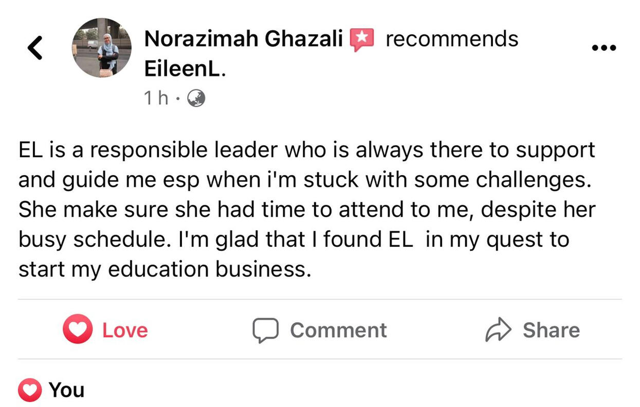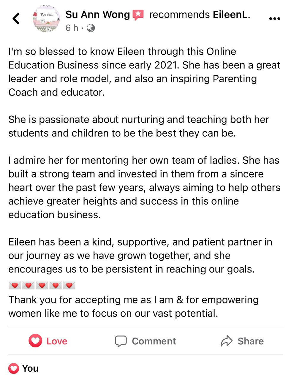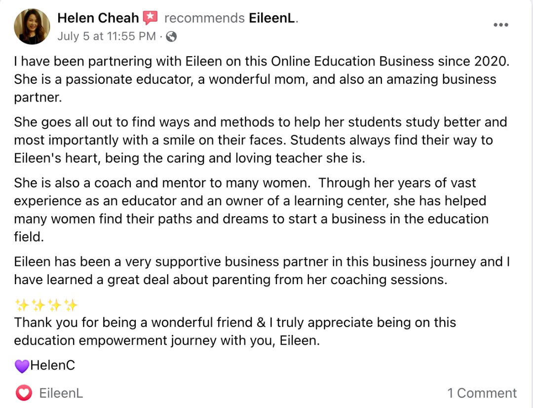 I'm a daycare and tuition centre owner with 12 years of experience in the education industry. Like many tuition centres, I've lost many students when the pandemic hit in the first year.However, I have since managed to grow my business when I added an online learning platform to my business in the following year. Our students population have now extended beyond the borders of my physical class with more than 350 students having a study buddy and allowing underprivileged kids access to learning.I now help other centre owners, private tutors and educators grow their income through this system.I also co-founded a women's only community (Women in Networking) to support and encourage fellow women to gain financial independence and confidence as home based entrepreneurs.